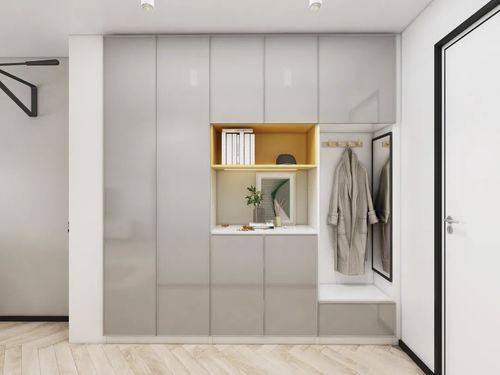 入门玄关柜是一套分区完善的定制功能柜,兼具了更衣、鞋柜、书柜等功能,淡雅清新配色加上黄色的点缀,让这个小家充满了活力。