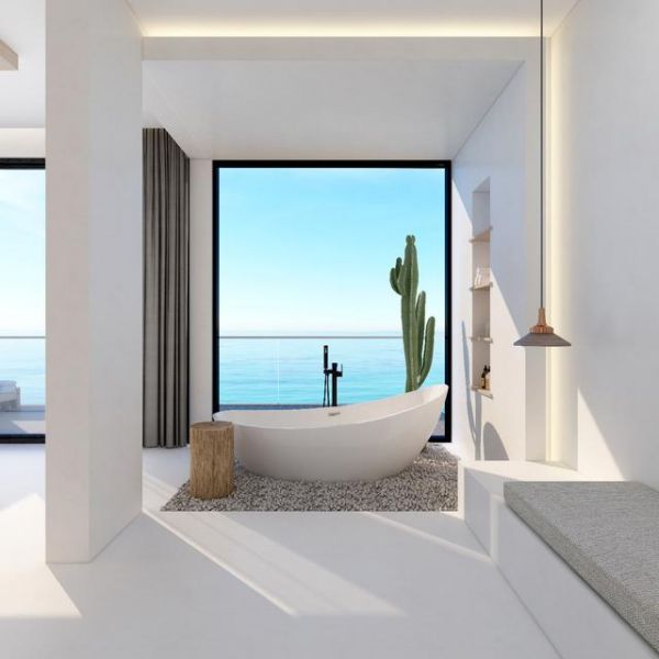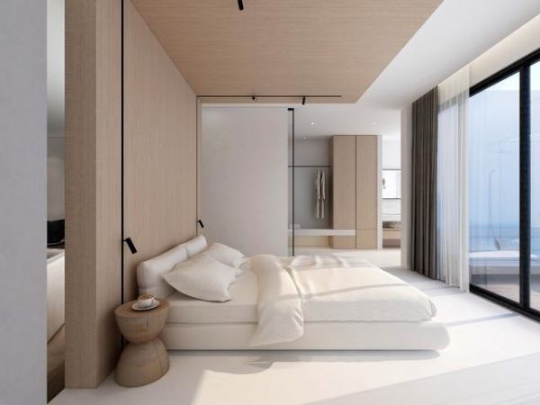 为了不喧宾夺主,突出海的美,李雪晴减少了厚重的装饰与多余的色彩,回归自然;房间的墙、地面均采用白色的纳米水泥。透过落地窗,房间的'白',与大海的'蓝',形成了一幅绝美的艺术画作。