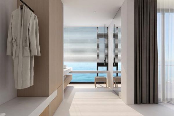 考虑到住酒店,其实呆的时间最长的,就是卧室与卫生间,包括泡澡。所以在平面功能规划上,将最美的景色留给了卧室,浴缸的位置,不光能让客人在泡澡的时候有美景作伴,同时也能让客人在进入房间后,穿过玄关便能欣赏到窗外的海景。此时便能卸下疲惫,开始享受这一切了……