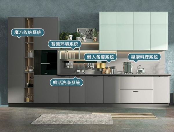 欧派厨房更加注重厨房的功能化:比如将厨房功能进行分区,规划出“洗涤+备餐+烹饪+收纳+智慧环境”五大系统,同时将厨房延展成厨房、餐厅、阳台三大空间,为消费者提供一站式解决方案。