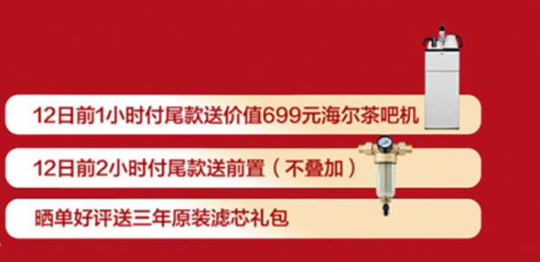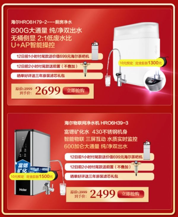 海尔玉清厨下净水器HRO8H79-2和海尔物联网厨房净水器钢锶侠HRO6H39-3两款预售单品均可享受12日前1小时付尾款送价值699元的海尔茶吧机、前2小时付尾款送前置(不叠加)、晒单好评送三年原装滤芯礼包等超值福利。