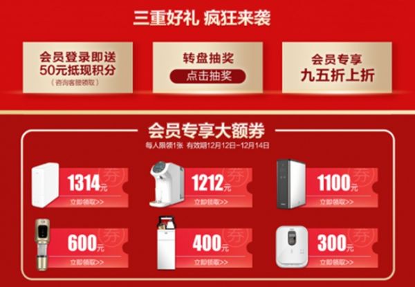 双12期间,会员登录即享三重好礼:一登录即送50元抵现积分(咨询客服领取);二转盘抽奖,内含前置过滤器、沐浴净化器、茶吧机、大额积分等好礼,快来试试能否锦鲤附体吧;三会员专享95折上折,可在双12的折扣力度上再享优惠。其中,最重要的一步就是记得领取会员专享大额券,最高可领1314元,每人限领1张哦~