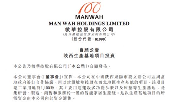 公司在中国陕西咸阳市设立新公司并与当地政府签订合作协议,用以建设敏华控股在西北地区生产基地的项目。公告称,该项目总工业用地为1100亩,其主要用途建设多功能沙发以及床垫等生产基地;是集研发、制造、销售和服务于一体的智能家居生产线。