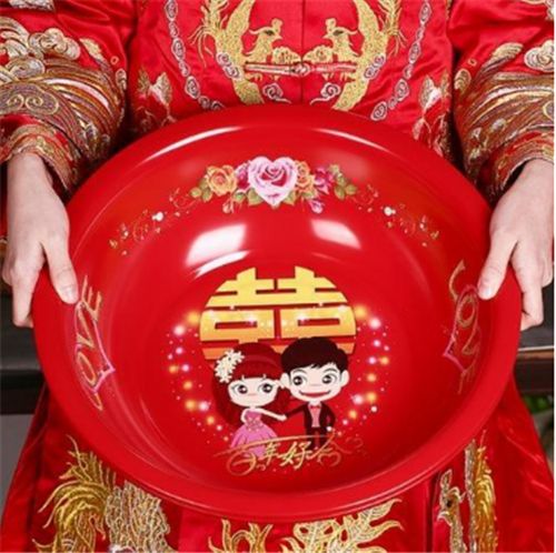 还要准备红色脸盆数量和子孙桶一样要两个,一个脸盆要放健康秤,王年青,而另一只放上新娘送给公婆的帽子和鞋子。