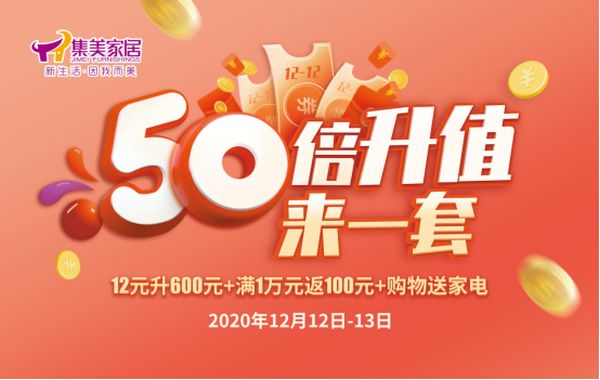 12月2日至11日,凡登录集美家居小程序的消费者,可参与每日15:00准时抢购12元升600元升值套券,数量有限,抢完为止!