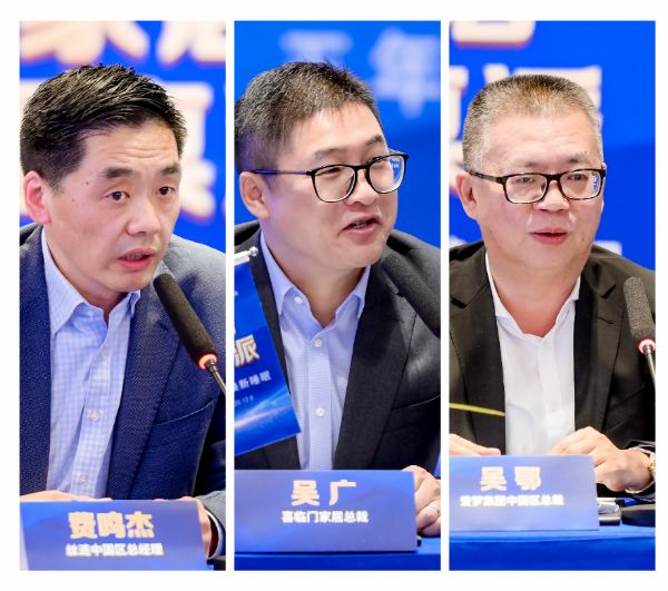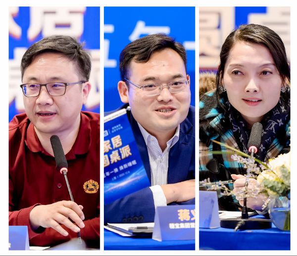 敏华控股集团副总裁兼五星床垫事业部总经理张旺(左);顾家家居床垫产品事业部总经理(中);红星美凯龙家居集团软床床垫事业部总经理杨骏(右)