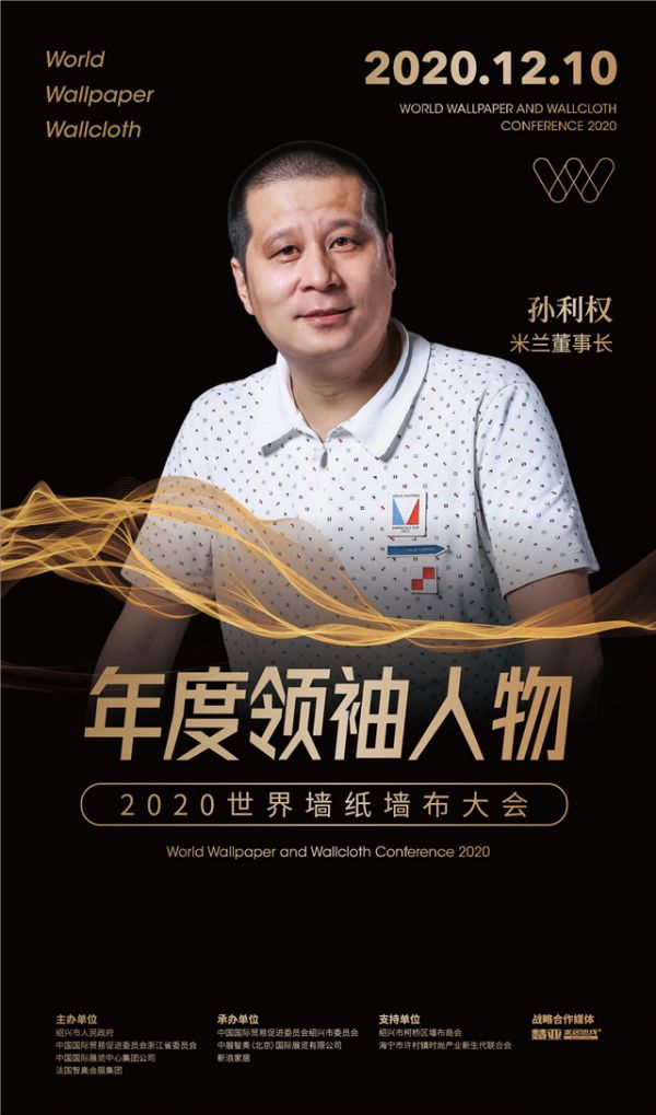 2020年12月10日,2020世界墙纸墙布大会于中国·绍兴鉴湖大酒店圆满成功落幕,米兰董事长孙利权先生被授予“年度领袖人物”奖项,以表彰其专注产品、深耕品牌、持续帮扶经销商群体,为行业蓬勃发展作出突出贡献。