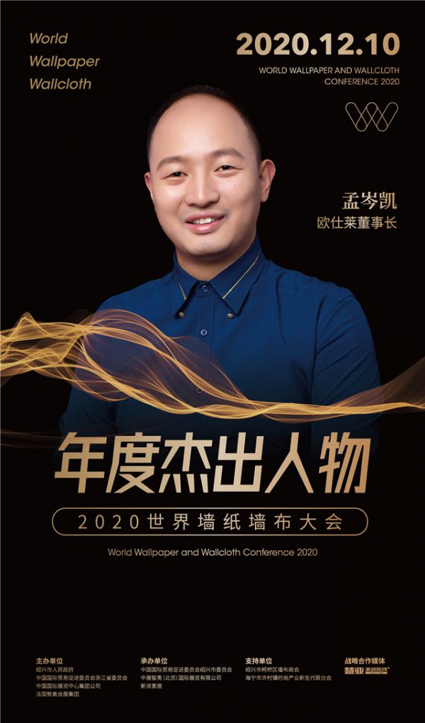 12月10日,由绍兴市人民政府、中国国际贸易促进委员会浙江省委员会,中国国际展览中心集团公司、法国智奥会展集团主办,中国国际贸易促进委员会绍兴市委员会、中展智奥(北京)国际展览有限公司、新浪家居承办,绍兴市柯桥区墙布商会作为支持单位协办的“2020世界墙纸墙布大会”在绍兴柯桥鉴湖大酒店隆重举行。欧仕莱董事长孟岑凯敢于试错,用脚丈量市场的宽度与广度,冲在行业与市场之前,开拓出属于他的新世界。在大会上,孟岑凯不负众望,荣获2020墙纸墙布大会“年度杰出人物”。