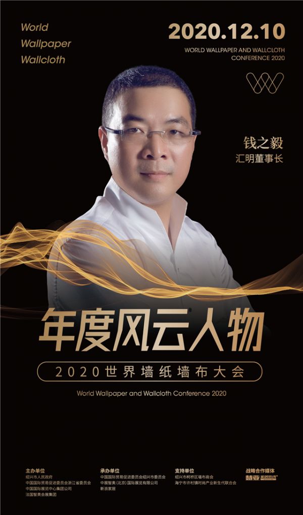 12月10日,由绍兴市人民政府、中国国际贸易促进委员会浙江省委员会,中国国际展览中心集团公司、法国智奥会展集团主办,中国国际贸易促进委员会绍兴市委员会、中展智奥(北京)国际展览有限公司、新浪家居承办,绍兴市柯桥区墙布商会作为支持单位协办的2020世界墙纸墙布大会在绍兴柯桥鉴湖大酒店顺利召开,此次大会对今年在墙纸墙布行业中作出重要贡献的企业和个人颁发了各项大奖,其中,行业最高个人奖项之一的“年度风云人物奖”由汇明集团董事长钱之毅等人荣获。
