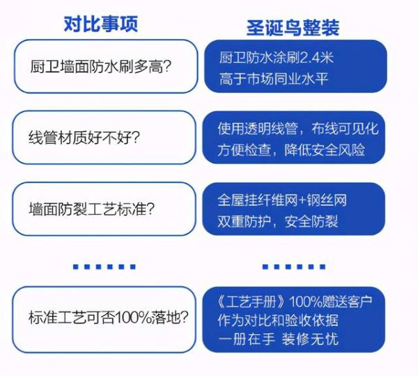 很多业主常常感慨即使去看了,也不知道质量做的到底怎么样。其实也很简单,只要对比几个关键的工艺细节,尤其是一些隐蔽工程细项特别需要仔细品一品。小编在这里还是建议大家在厨卫防水、墙面防裂、线管材质、以及展示性工艺能否落地等多个方面对比。以圣诞鸟整装为例,在厨卫防水涂刷2.4m是远高于市场上1.8m的平均水平的;在墙面防裂上,圣诞鸟整装有纤维网+钢丝网+布带工艺的三重防护。