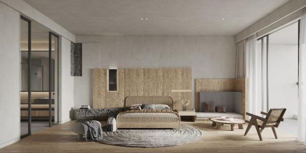 李银最终提交的作业,整体设计的空间近似侘寂风,并大体选择了源于自然最本真的材料,比如木头、粗糙的石头。"我想用这些自然的材料来做一个能让人在里面有一种身处自然的状态,可以完全放松自己享受假期,观花开花落,行山穷水尽,望云卷云舒。与林为伴,结山为伍。远离城嚣,隔绝尘杂, 宁静致远,得返自然。"
