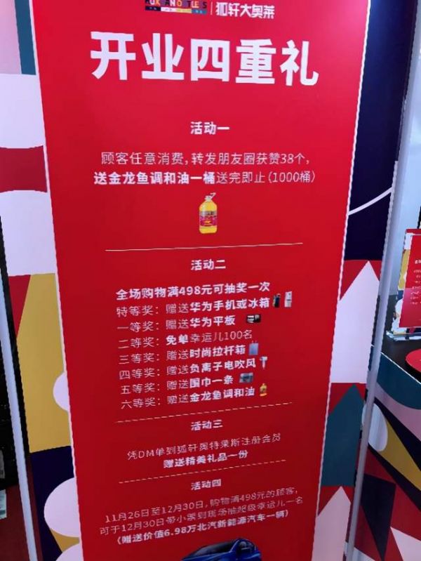 而这还不算什么,在湖南本土,胡轩联合特步等知名品牌打造的“狐轩大奥莱”特卖场,一些基础款的HX品牌衣服仅卖到十几元,最高也不超过百元。其他品类的品牌商家产品大多也只要3元,10元,19元,99元,,绝对“品质堪比CBD ,价格低过拼多多,”且促销福利轮番送,送汽车,送拉杆箱,送华为手机这些在4S店和楼盘购房才有的活动力度,在狐轩大奥莱,随便几件衣服包包就可以参与!