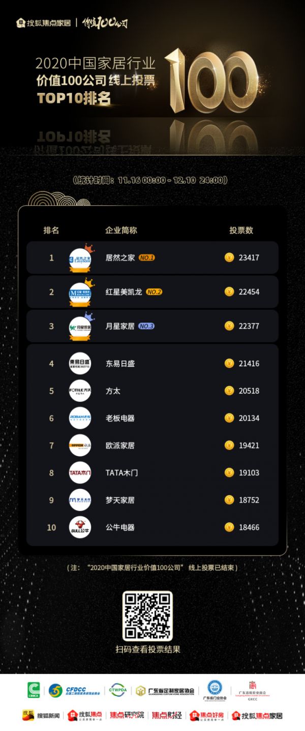 “2020中国家居行业价值100公司”线上投票榜单中,居然之家以23417票高居榜首,红星美凯龙、月星家居分列榜单二三名,前三甲被实力雄厚的建材家居卖场占据。