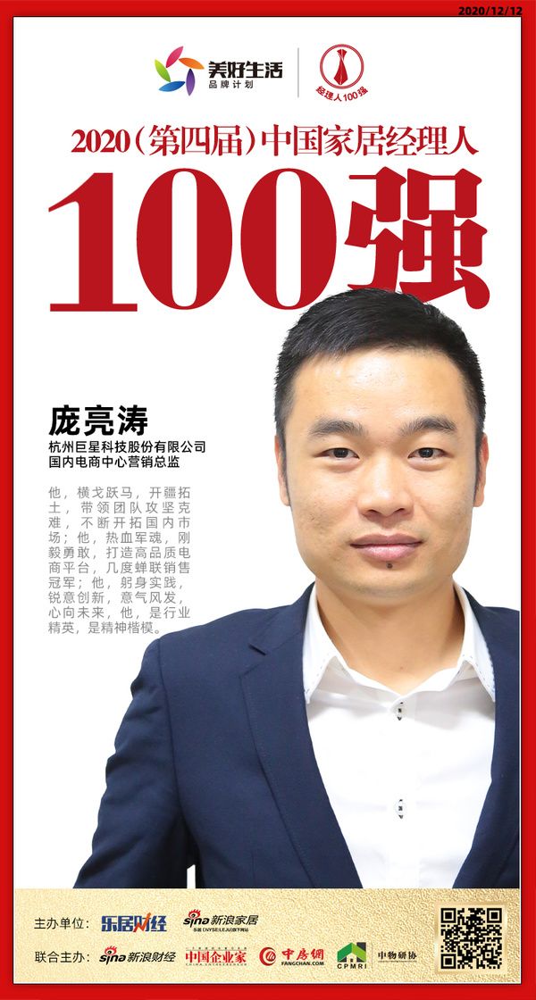 2020年12月12日,“行稳致远——2020(第四届)中国地产新时代盛典暨对话中国家居·2020变局与展望创新峰会”在上海国家会展中心举行。盛典现场,“2020(第四届)中国家居品牌经理人评选”结果揭晓,土猫网营销总监庞亮涛荣获“2020中国家居品牌经理人100强”。