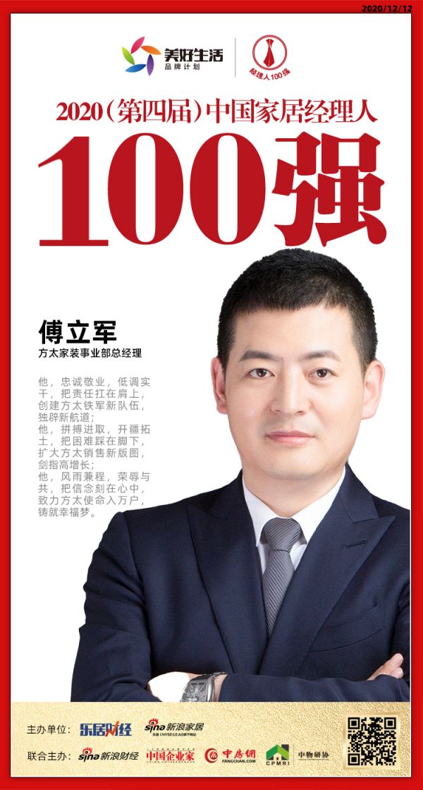2020年12月12日,“行稳致远——2020(第四届)中国地产新时代盛典暨对话中国家居·2020变局与展望创新峰会”在上海国家会展中心举行。盛典现场,“2020(第四届)中国家居品牌经理人评选”结果揭晓。方太家装事业部总经理傅立军荣获“2020中国家居品牌经理人100强”。