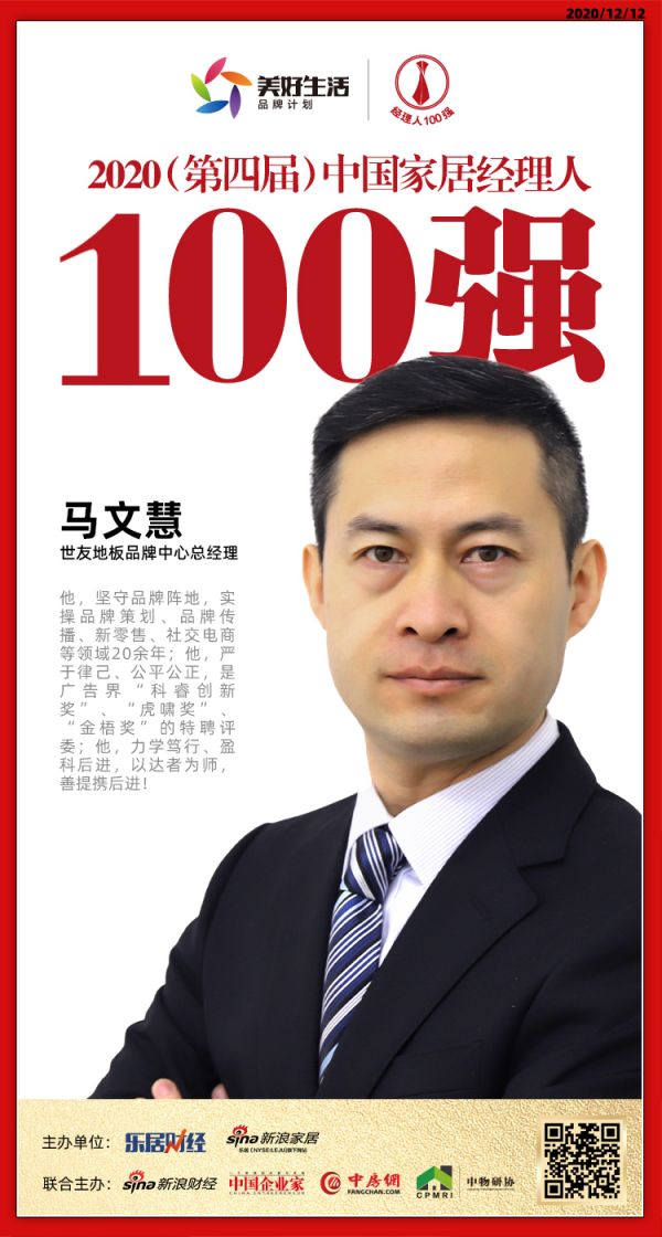 2020年12月12日,“行稳致远——2020(第四届)中国地产新时代盛典暨对话中国家居·2020变局与展望创新峰会”在上海国家会展中心举行。盛典现场,“2020(第四届)中国家居品牌经理人评选”结果揭晓。世友地板品牌中心总经理马文慧荣获“2020中国家居品牌经理人100强”。
