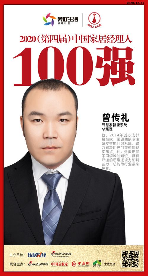 2020年12月12日,在上海国家会展中心举行的“行稳致远-对话中国家居 2020变局与展望创新峰会”现场,“2020年(第四届)中国家居经理人评选”结果揭晓。易慧家智能系统总经理曾传礼荣获“2020(第四届)中国家居经理人100强”。