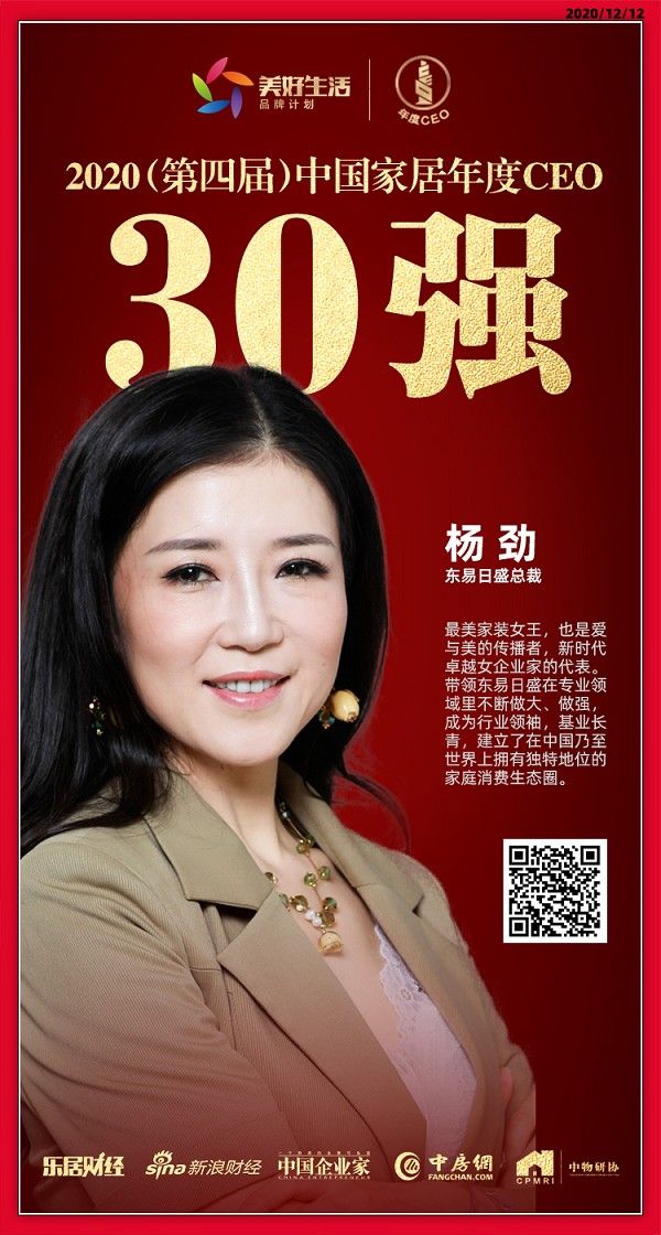 东易日盛总裁杨劲从众多候选人中脱颖而出,荣获“2020中国家居年度CEO30强”。