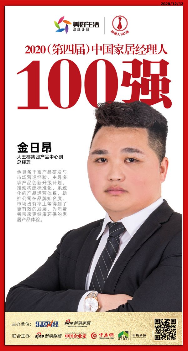 2020年12月12日,“行稳致远——2020(第四届)中国地产新时代盛典暨对话中国家居·2020变局与展望创新峰会”在上海国家会展中心举行。盛典现场,“2020(第四届)中国家居品牌经理人评选”结果揭晓。大王椰集团金日昂荣获“2020中国家居品牌经理人100强”。