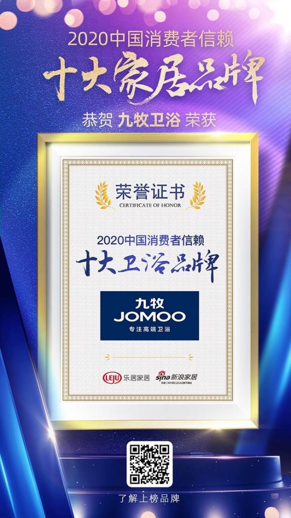 快讯:九牧厨卫荣获2020消费者信赖十大卫浴品牌