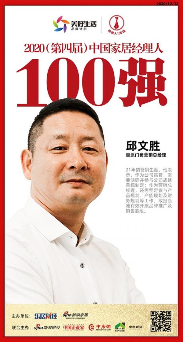 快讯:皇派门窗营销总经理邱文胜荣获2020中国家居品牌经理人100强