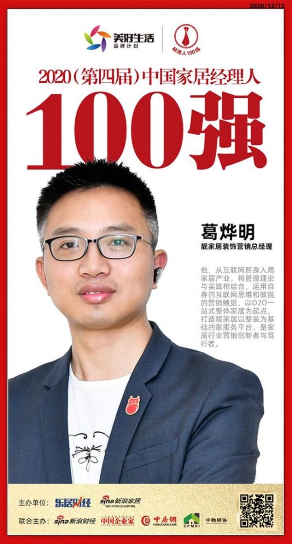 2020年12月12日,“行稳致远——2020(第四届)中国地产新时代盛典暨对话中国家居·2020变局与展望创新峰会”在上海国家会展中心举行。盛典现场,“2020(第四届)中国家居品牌经理人评选”结果揭晓,靓家居整装营销总经理葛烨明荣获“2020中国家居品牌经理人100强”。