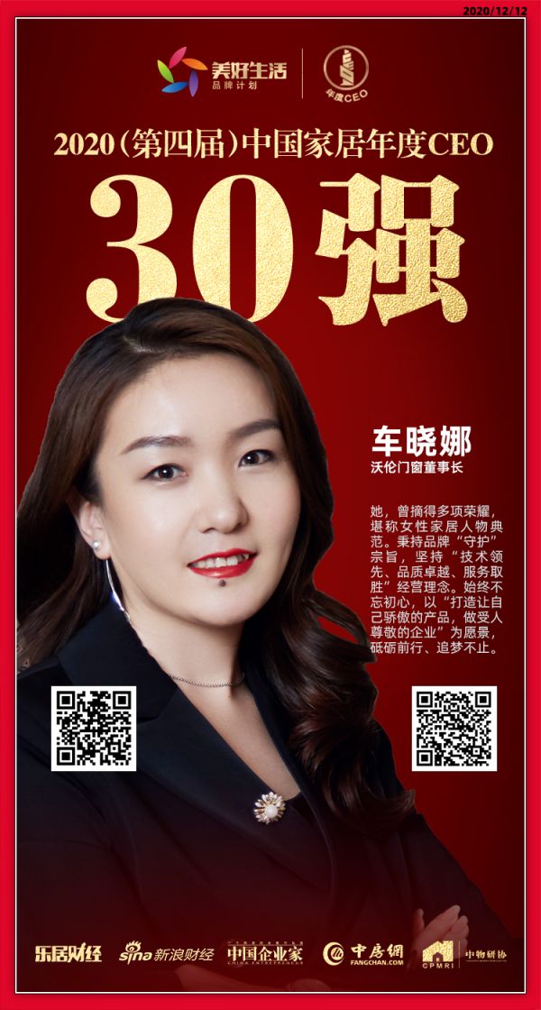 新浪家居讯12月12日,在上海国家会展中心举行的“行稳致远-对话中国家居2020变局与展望创新峰会”现场,“2020年(第四届)中国家居评选”结果揭晓。沃伦门窗董事长车晓娜荣获“2020(第四届)中国家居年度CEO30强”。>>>点击查看更多内容
