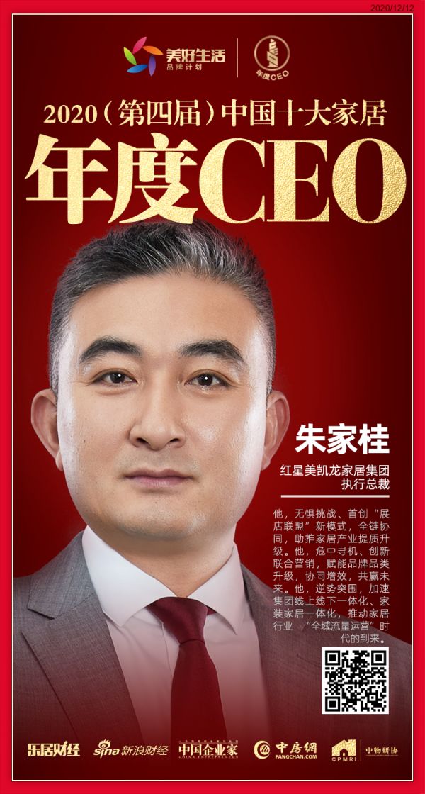 2020年12月12日,“行稳致远——2020(第四届)中国地产新时代盛典暨对话中国家居·2020变局与展望创新峰会”在上海国家会展中心举行。盛典现场,“2020(第四届)中国家居年度CEO评选”结果揭晓,红星美凯龙家居集团执行总裁朱家桂荣获“2020中国十大家居年度CEO”。