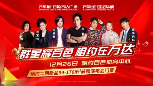 “群星耀百色·相约在万达”2020亚洲群星演唱会将于2020年12月26日在百色市体育中心隆重上演。本次演唱会由百色万年城投资有限公司主办,万年城·世纪华府总冠名,湛江市蓝大传媒有限公司策划执行。