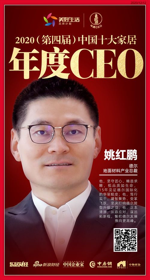 【新浪家居讯】12月12日,在“2020(第四届)中国地产新时代盛典”现场,德尔地面材料产业总裁姚红鹏荣获“2020中国十大家居年度CEO”!本次盛典在上海国家会展中心举行,来自地产物业家居三大行业约1000位精英参会。姚红鹏获奖后走进“乐居红人节”直播间,接受乐居主播采访,并分享获奖感言!