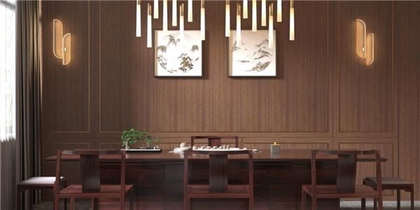 新中式茶室讲究在空间设计上营造舒适静雅的氛围。镜观家居新中式茶空间定制,从红木家具陈设到到各种墙面地砖、灯具器皿,都以简洁的造型、纯洁的质地、精细的工艺体现出当代极简新中式的风格。