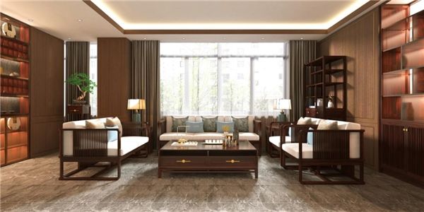 工整布局的茶空间无论是木质的色彩,还是新中式流畅的线条,都给人一种宁静致远的感觉。沙发家具的设计上利用布艺和黑酸枝两种不同材质形成视觉的碰撞,更加突出了新中式风格独有的艺术气质和大气端庄。
