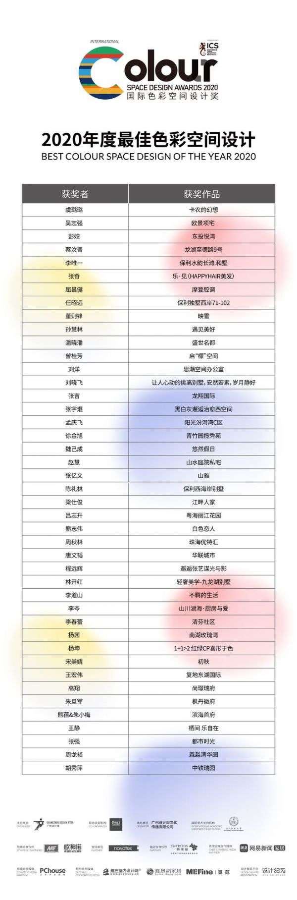 而这些作品,更是在优秀色彩空间奖中脱颖而出,揽获最佳色彩空间设计奖!以下为2020最佳色彩空间设计奖获奖名单及作品一览: