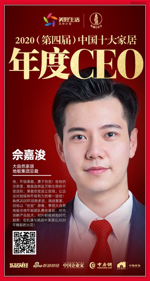 佘嘉浚表示,今年公司做了很多新的尝试,获得“年度CEO”荣誉,是对大自然地板团队上下的肯定。2020年,家居建材市场挑战重重,面对困局,大自然家居地板在佘嘉浚的带领下,以“创变”为核心战略,上下一心,对外研判市场趋势、灵活应对,对内苦练内功、深耕技术、做好产品,为用户带来更好的装修体验,展现出了非同一般的创新与果敢精神。