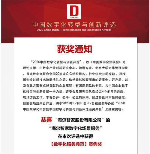 在刚刚公布的"2020中国数字化转型与创新评选"中,海尔智家数字化场景服务获得"数字化服务典范"案例奖,并入选《2020中国数字企业白皮书系列》,成为行业唯一入选案例,为行业树立了数字化场景服务示范样板,推动行业加快布局数字化服务生态。
