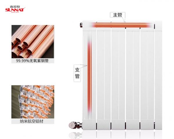 森拉特铜铝复合暖气片采用99.99%无氧紫铜管作为过水管道,结合高效导热的6063航空级钛镁铝型材,在最大可能性减少暖气片腐蚀漏水的情况下实现更加高效的散热效果。热量从铜管传递到铝翼上得到充分的挥发辐射,可谓材质的强强联合。