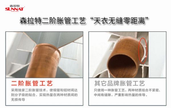 部分用户总觉得铜铝复合暖气片的铜和铝的膨胀系数不同,这两种材质结合久而久之就会导致热衰减。森拉特可以很负责的告诉你,这一点主要看工艺技术,森拉特独有的二阶胀管技术,解决的普通单一胀管技术无法解决的铜铝之间缝隙所带来的热衰减问题,而且有效的提升了热传导效果。而森拉特的攻螺纹工艺,则是先把铜件焊接主管,再重新车螺纹丝,从而实现在安装暖气阀门时,螺纹完全贴合密封。