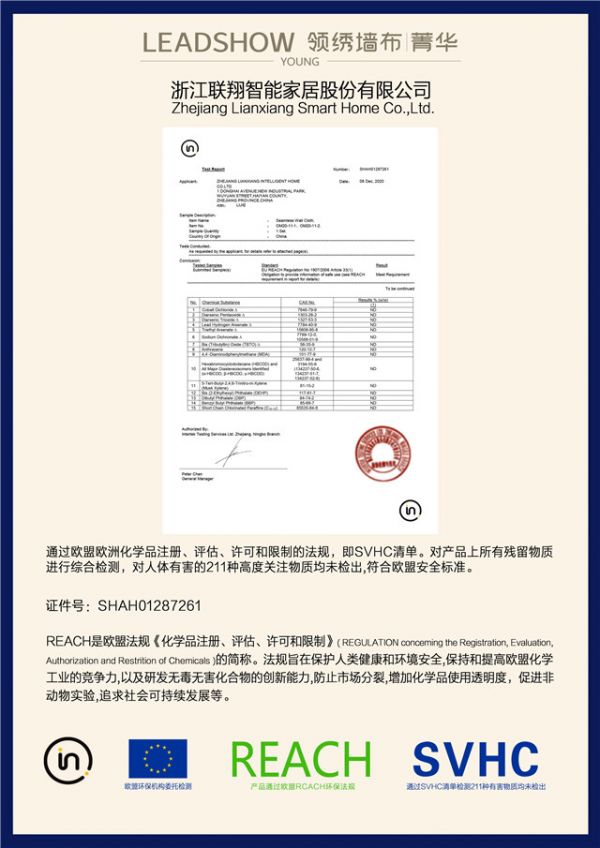 众所周知,领绣墙布获得了儿童级安全环保认证证书、产品碳足迹证书、健康建材标志证书等众多环保认证,但是,领绣对产品的安全环保性能有着更加严苛的标准。