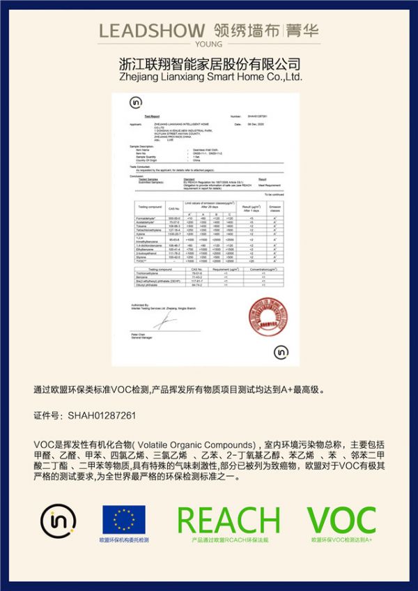 领绣认为,健康环保是时代的大势所趋,是一个行业保持生机与活力的关键,也是一个企业产品最重要、也是最基本的要求。此次第三方实验室检测结果,进一步展现了领绣对产品环保性能的严苛要求,既是领绣企业发展史上的重要事件,也将对墙布行业产生重大影响,在室内软装行业具有很强的引导意义。