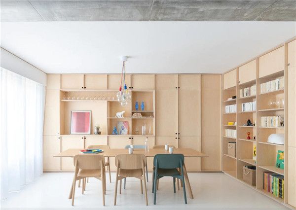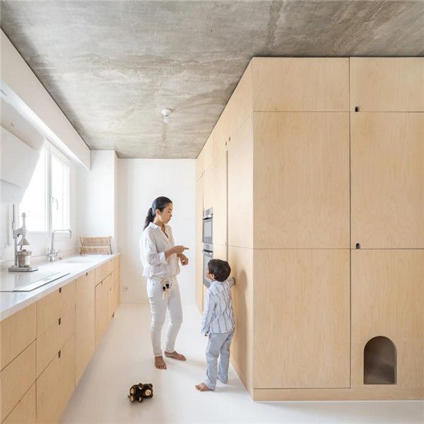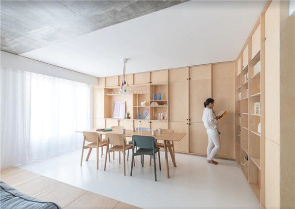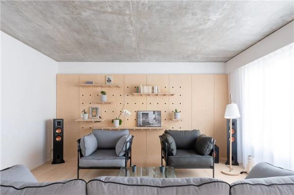 乍一看,这个公寓的设计好像有点日系,但事实上它里面综合使用了大量的现代设计元素,是个正儿八经的现代公寓。在设计元素上,设计者主要使用了海桦木胶合板、白色树脂胶和原来的混凝土基层,这三种元素大家肯定都清楚,妥妥的素色系设计标配。
