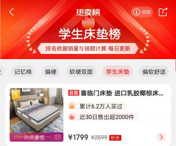 此外,喜临门的产品布局也瞄准了学生市场,对学生党的需求进行定向满足。今年双11在京东热卖榜的学生床垫榜单上,喜临门的进口乳胶椰棕床垫以销量和销额第一的成绩位列榜首,足见学生群体对喜临门品牌的青睐。