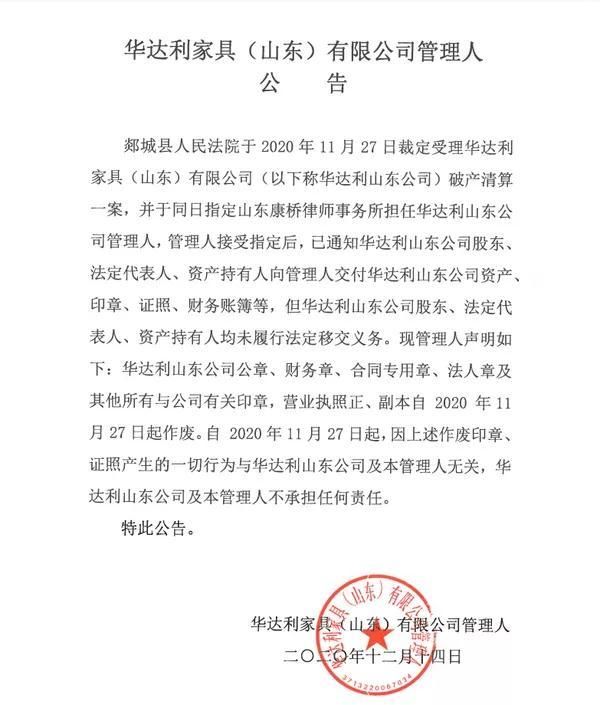 12月14日,山东康桥律师事务所公开《关于华达利家具(山东)有限公司印章、证照作废公告》。