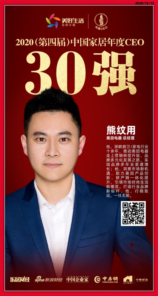 【新浪家居讯】12月12日,在“2020(第四届)中国地产新时代盛典”现场,奥田电器总经理熊纹用荣获“2020中国家居年度CEO 30强”!本次盛典在上海国家会展中心举行,来自地产物业家居三大行业约1000位精英参会。熊纹用获奖后走进“乐居红人节”直播间,接受乐居主播采访,并分享获奖感言!
