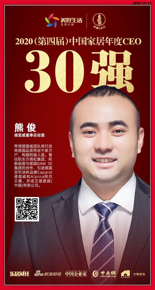 在相对艰难的2020年中,能够荣获“中国家居年度CEO30强”称号,熊总认为,这是对德爱威的肯定,也是国家对于经济、民生扶持之后显现的良好结果,在这样的背景下,家居行业也取得了较大的发展。