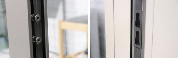 门扇采用自主研发的塑胶+铝合金膨胀自紧组合注胶角码,使门扇45度拼接更牢固,强度比一般角码增加1.5倍。