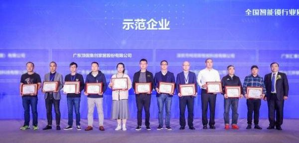 △顶固公司代表(左二)上台领取“全国智能锁行业质量提升行动示范企业”荣誉