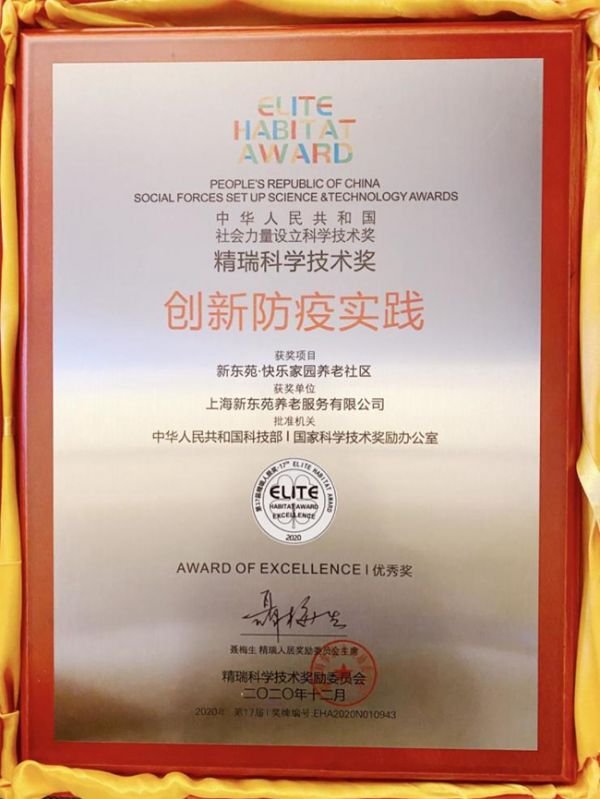 2020年12月13日,以“聚焦大循环,助力新消费”为主题的全联房地产商会2020年会暨第17届精瑞人居奖颁奖典礼活动在北京举行。新东苑集团养老项目——“新东苑·快乐家园”继2018年、2019年荣获精瑞人居美好社区奖和幸福社区奖之后,2020年再次荣获精瑞科学技术奖之创新防疫实践奖。