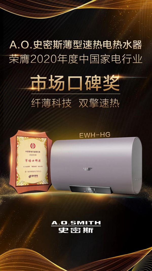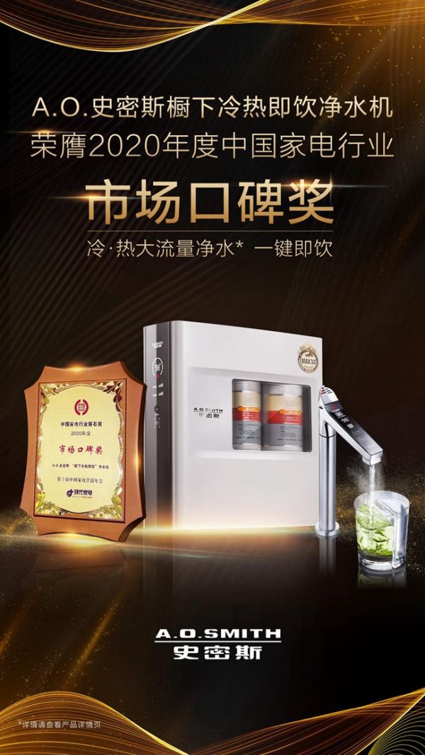 精准把握消费者需求变化,以突出的研发实力与优异的产品品质,成就卓越的市场口碑,A.O.史密斯两款畅销精品:"薄型速热"电热水器、“橱下冷热即饮”净水机,引领了市场潮流,荣获年度“市场口碑”大奖。