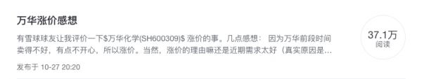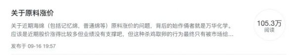9月16日,倪张根就在雪球发布关于了一篇关于原料涨价的文章,“关于近期海绵(包括记忆绵,普通绵等)原料涨价的问题,背后的始作俑者就是万华化学”,并且直指万华化学涨价是“杀鸡取卵的行为,最终只有被市场给唾弃”。