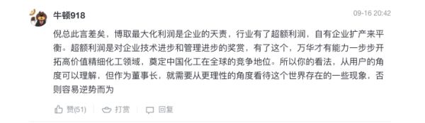10月27日,倪张根又发布了文章《万华涨价感想》,分析了万华化学涨价的原因。“涨价的理由还是近期需求太好,真实原因是海外疫情导致供给出了问题,包括原料和下游产能,某些人的一己私利总是在伤害行业”。